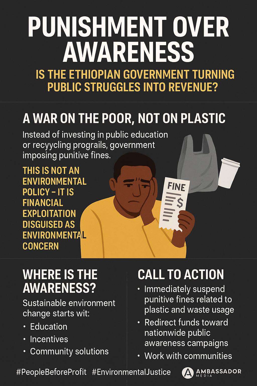 Instead of investing in public education, community clean-up initiatives, or accessible recycling programs, the government has chosen the path of punishment over awareness. With fines ranging from hundreds to thousands of birr, working-class families are now forced to choose between food on the table and avoiding government-issued penalties.